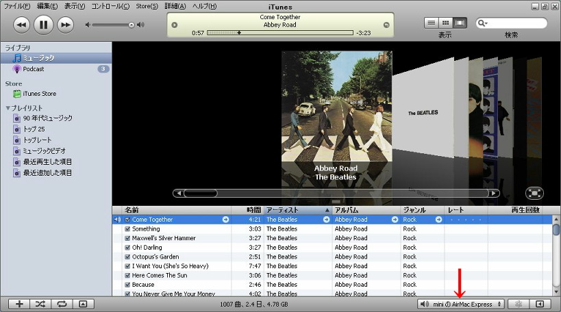 設定後にiTunesを立ち上げると、赤矢印のところにポップアップメニューが出現しAirMac Expressを選べば音が出てきます。