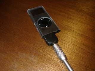 左がiPodのラインアウトドック(3.5mmミニジャック付き・Yahoo!オークションにて入手)と、