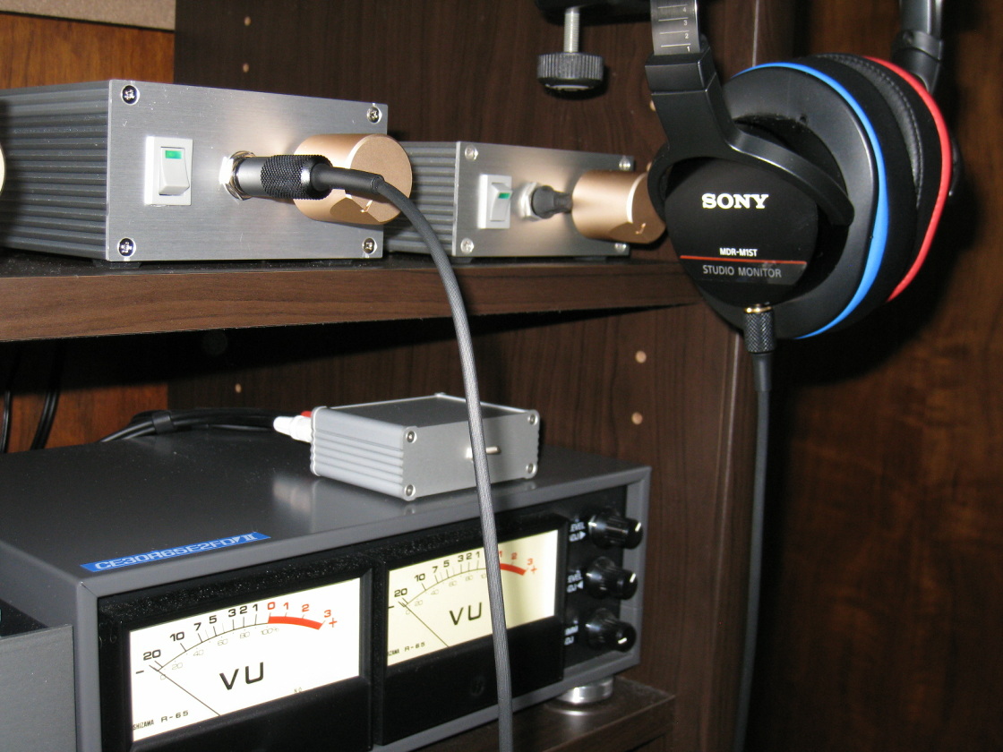 スイッチを切り替えて「減衰なし」で使ってます。これで11時くらいで丁度良い音量になります。VUメーターの上にある小さなケースがアッテネータBOXです。