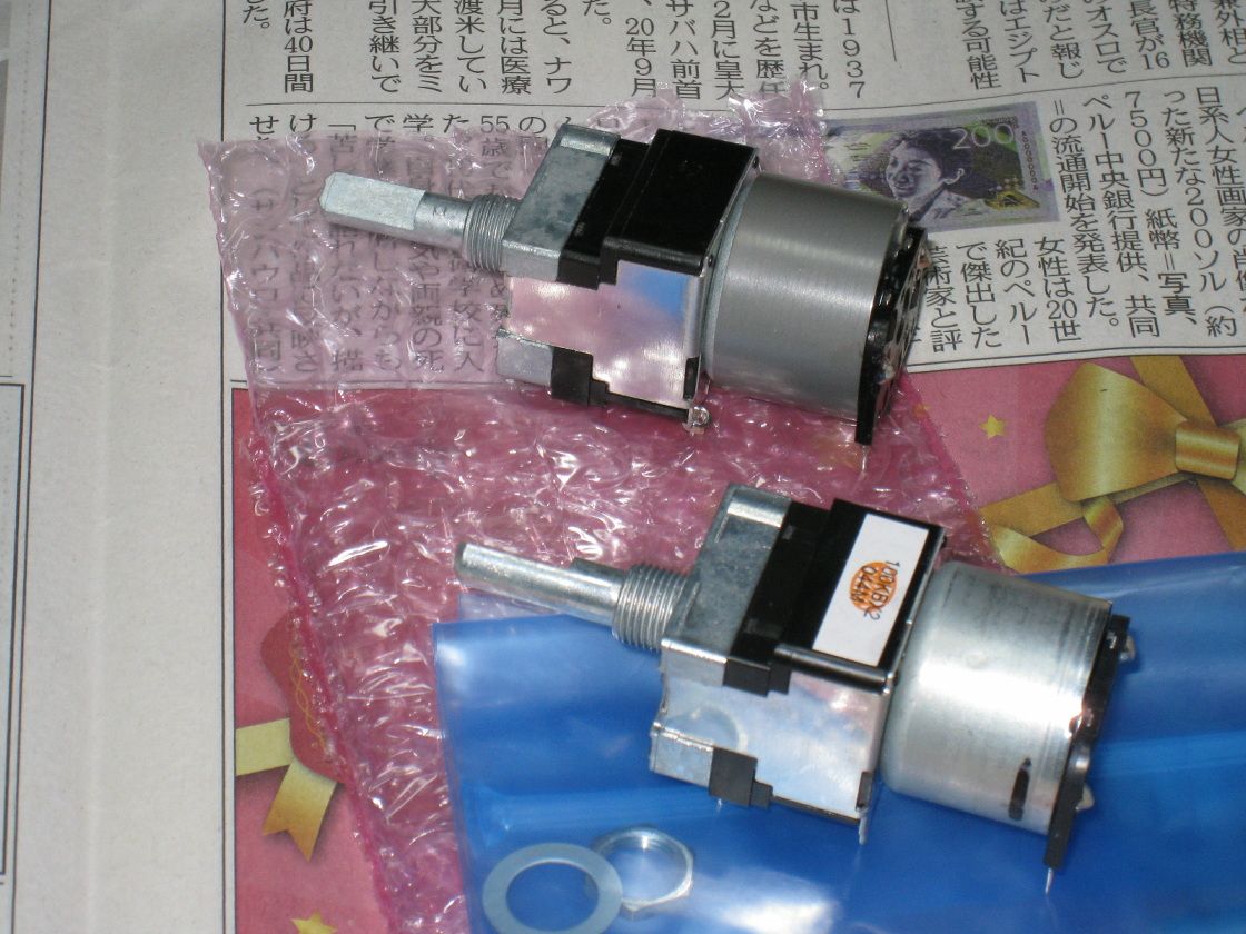 で、手前が購入したアルプス電気の電動ボリュームRK16812MG099(抵抗値100KΩ)で、奥のものは基板に同封されていた