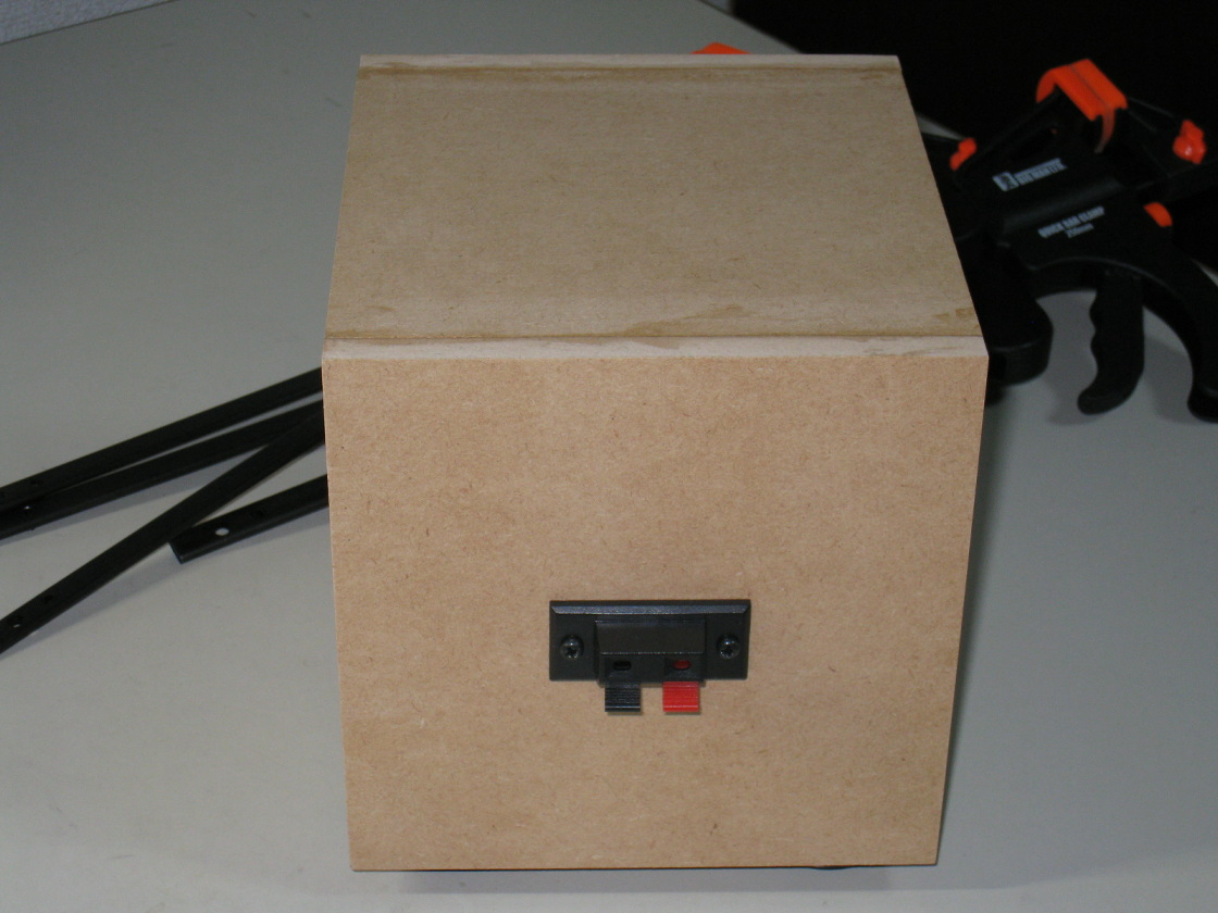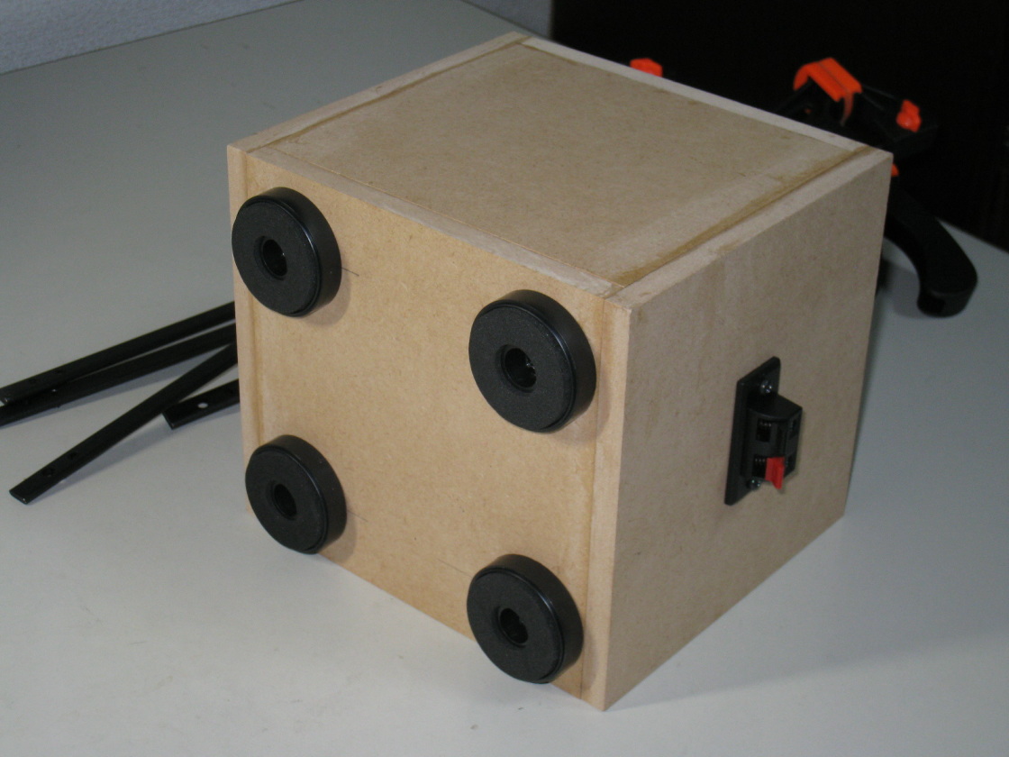 エンクロージャーが完成。吸音材はどの程度が良いか判らず適当に入れました。足の部品も余っていたので取り付け。(2026年2月24日完成)