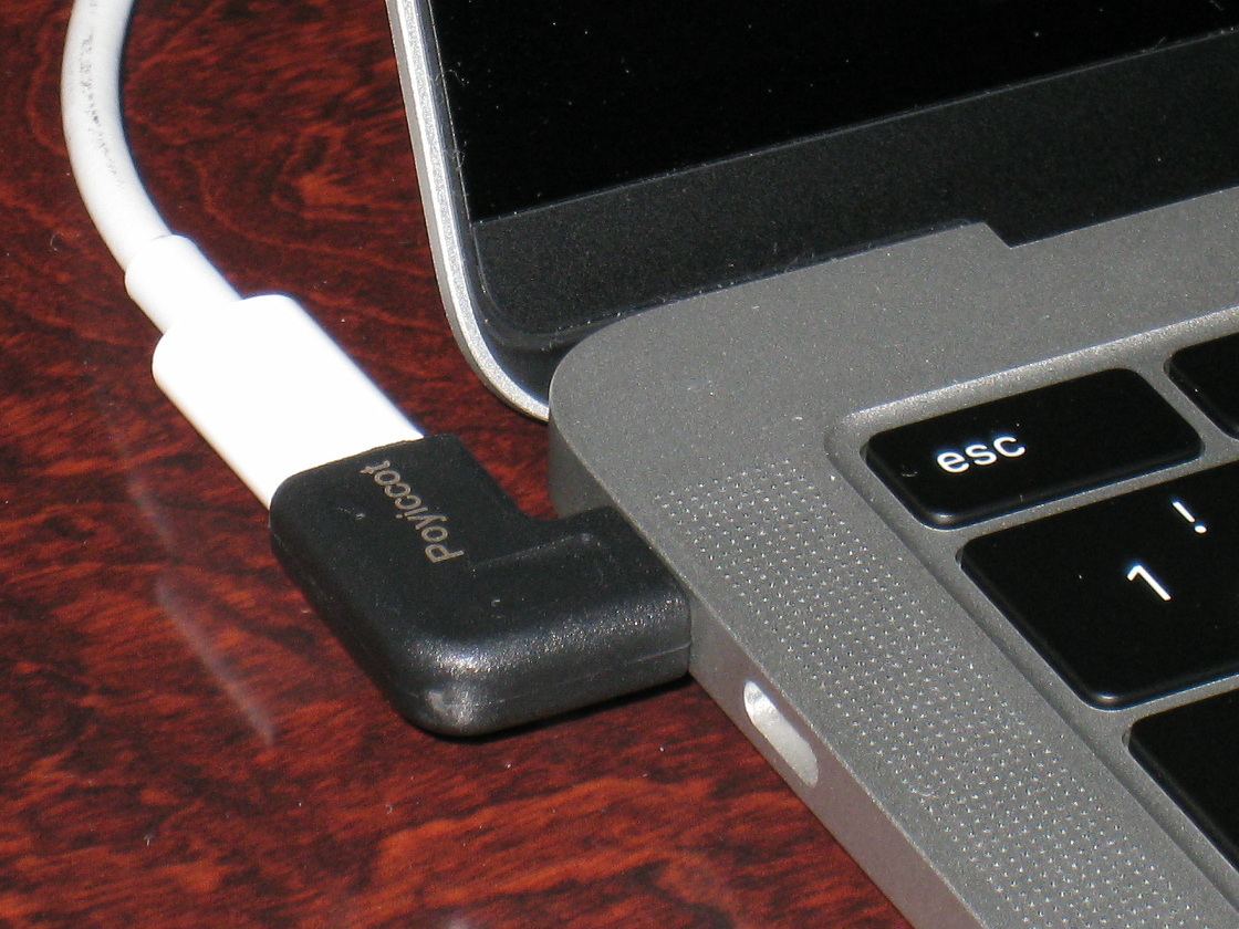 右上の写真のように、電源ケーブルに負荷がかかるので、USB-C オス・メス コネクタ L字型変換アダプタを追加しました。(2019年8月7日購入)